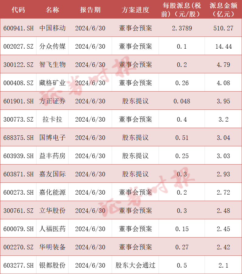 此外,智飞生物、藏格矿业、方正证券等不少公司半年度分红不低于3亿元,立华股份、人福医药(维权)、银都股份等中报分红金额超过2亿元。